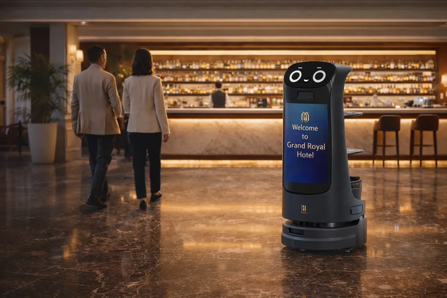 In hospitality l’esperienza inizia prima della camera: ingresso, hall, orientamento e messaggi di servizio. In alcune configurazioni, un robot con display supporta accoglienza e comunicazione su aree di passaggio, senza aggiungere carico operativo.